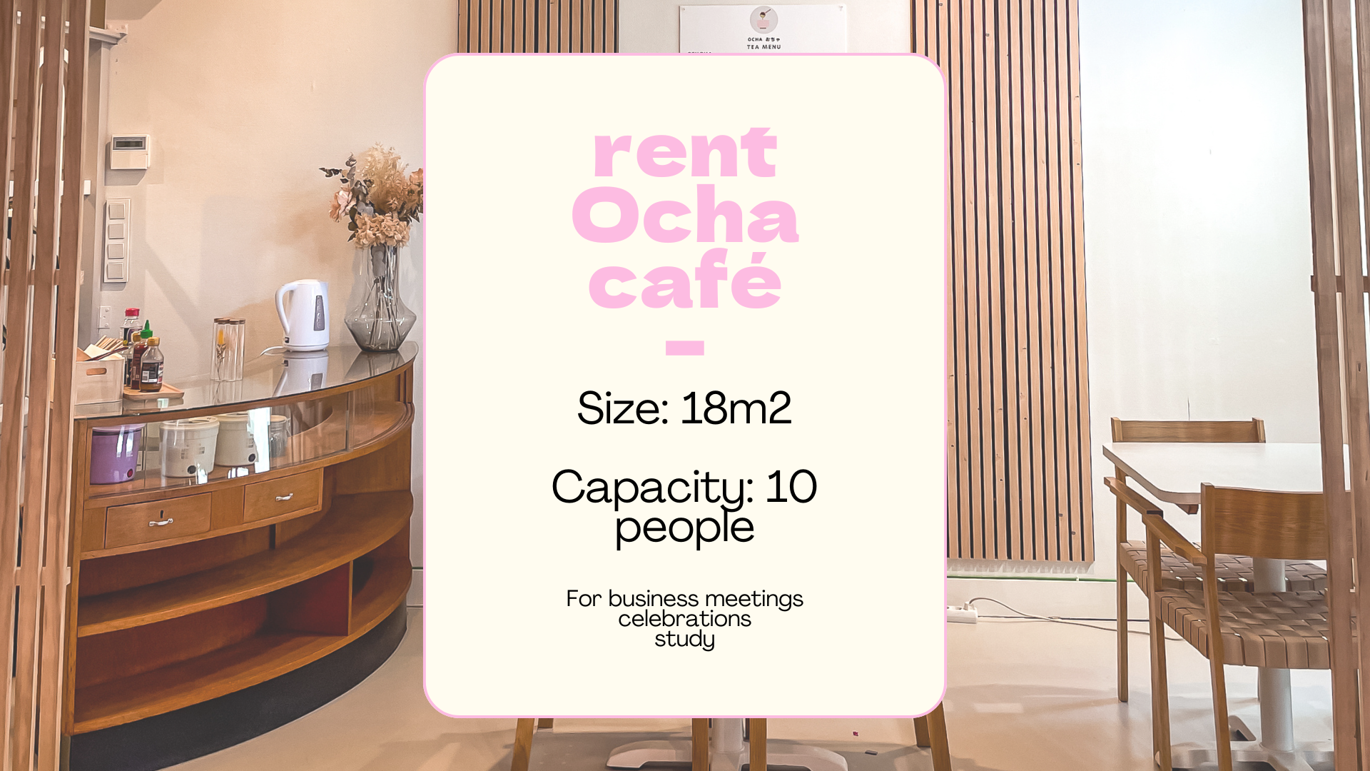 Simply rent our Ocha café by the hour. See the rental prices and availability below.